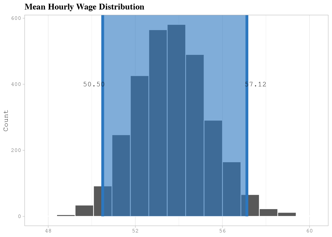 - Resample with replacement a new 60 days hourly wage 3,000 times and calculate the mean of each resample.