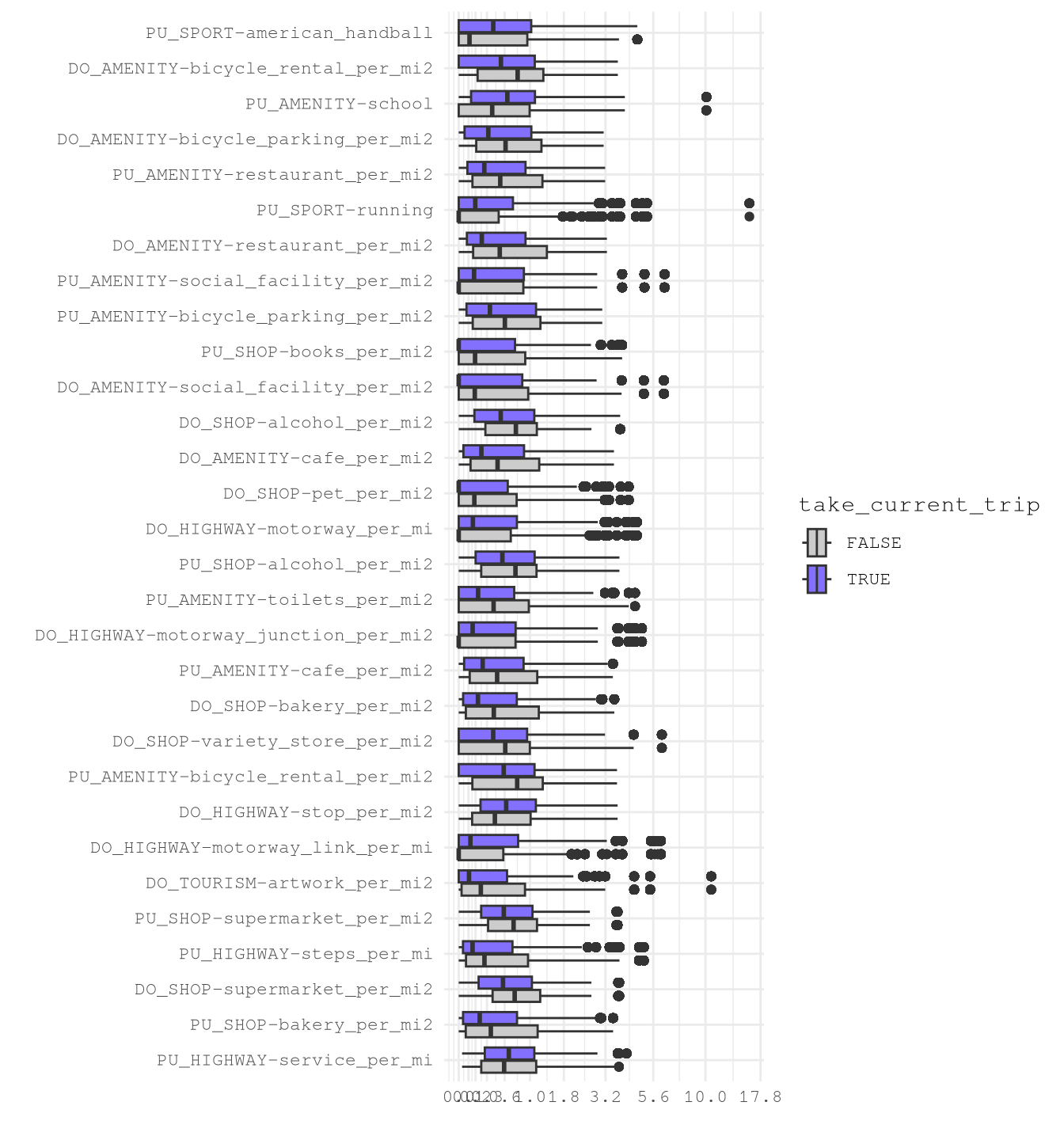 | PU_AMENITY-restaurant_per_mi2 | Median lower when take_current_trip is TRUE. |